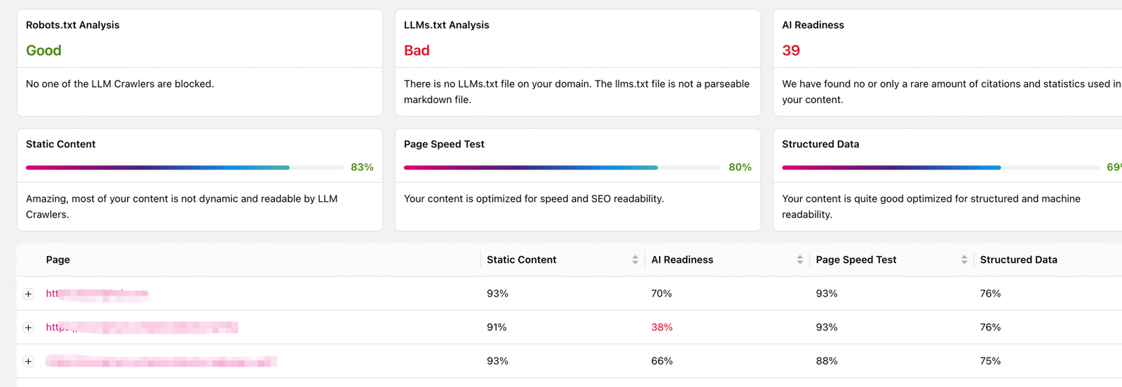 这个模块的功能是检测你的网站技术层面是不是符合GEO优化的标准,比如robots.txt,llms.txt文件,网站内容和结构是否满足AI阅读喜好,另外还有具体的每个页面的详细得分。