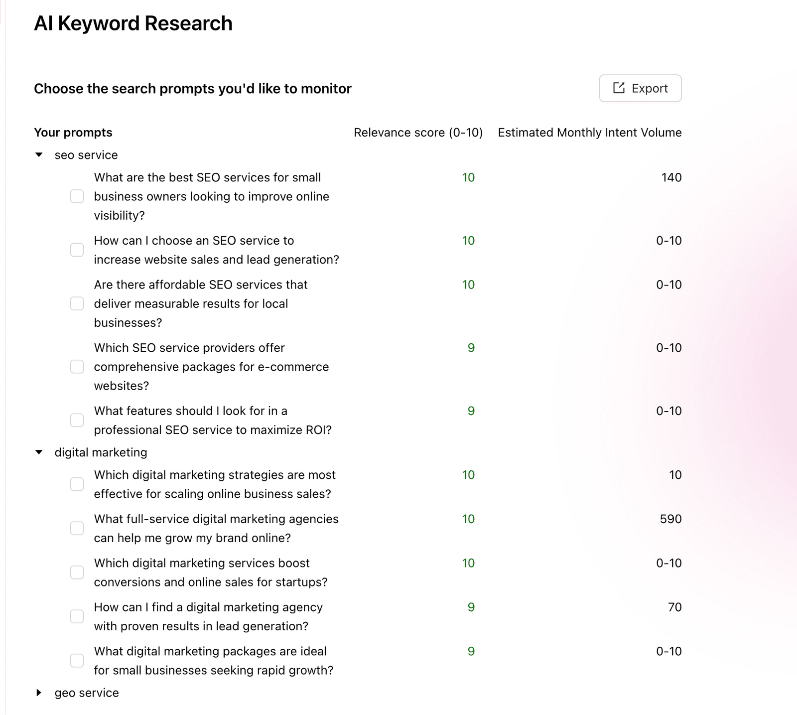 比如我填写了seo service,digital marketing,geo service关键词,它自动给我生成一些prompts