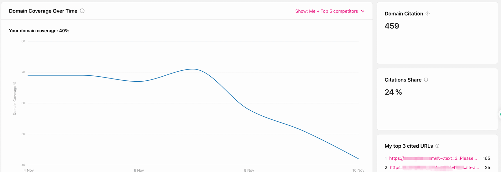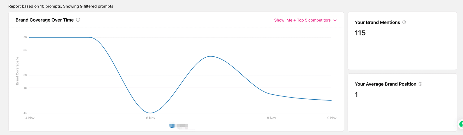 - 可以自动追踪你的brand mentions以及Share Of Voice,比如你的品牌在哪个AI平台被提到,通过哪些prompts被提到,哪些页面被推荐了等等。
