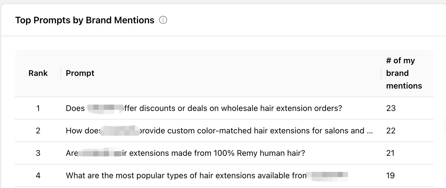 这些prompts按照相关性以及预估的月搜索量排列,我个人认为这个月搜索量不是很准确,因为不同的AI用户会使用不同的prompts来找答案,同一个AI用户在不同时间也会使用不同的prompts来搜同一个产品,不像关键词容易被计入统计。