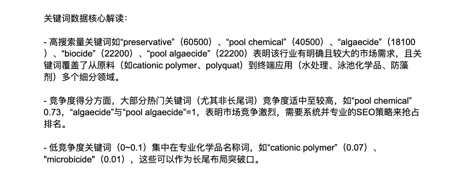 一开始她的策略是做water treatment chemical这类大词,但是经过我比较系统和专业的分析,最终我们把这个词从排名策略中砍掉了。