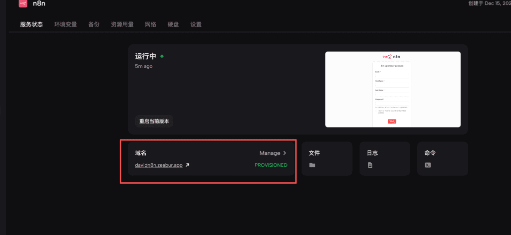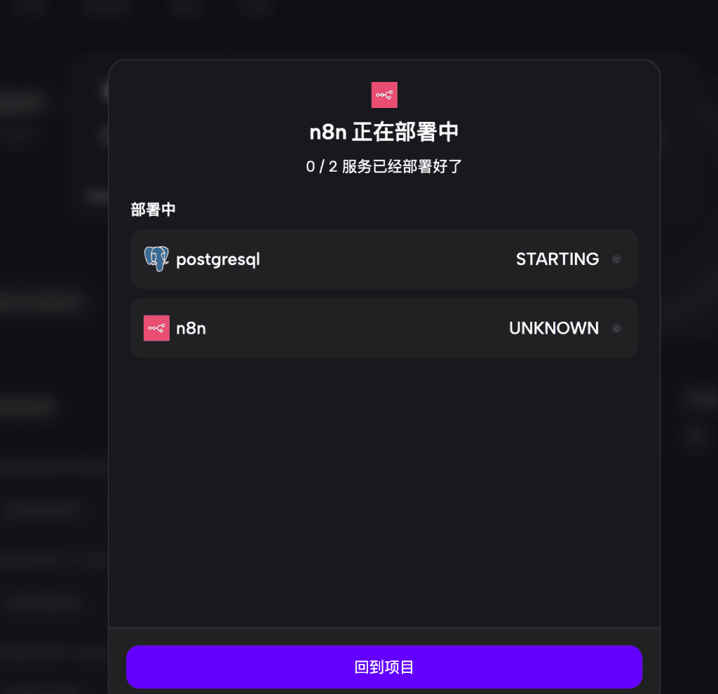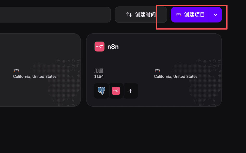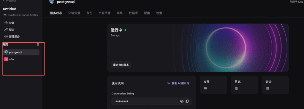 部署完成以后,你会看到左边有两个模块,一个是数据库,一个是N8N,数据库就是用来存储你在N8N上执行创建的各种数据。