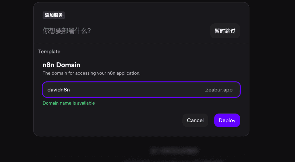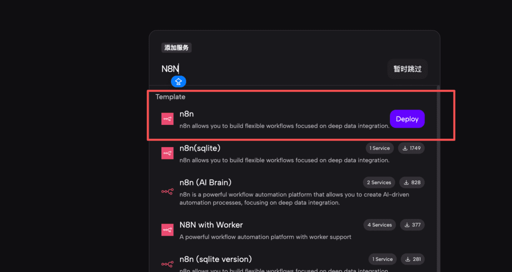 7,选择好机房以后,在出现的搜索框里填写N8N,结果中选择N8N点击deploy部署