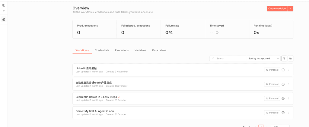 11,进入N8N后台以后,你的界面应该是一个workflow也没有,没关系,我们直接点击create workflow来创建你的第一个工作流,N8N官方也给你自动配置了2个学习的workflow