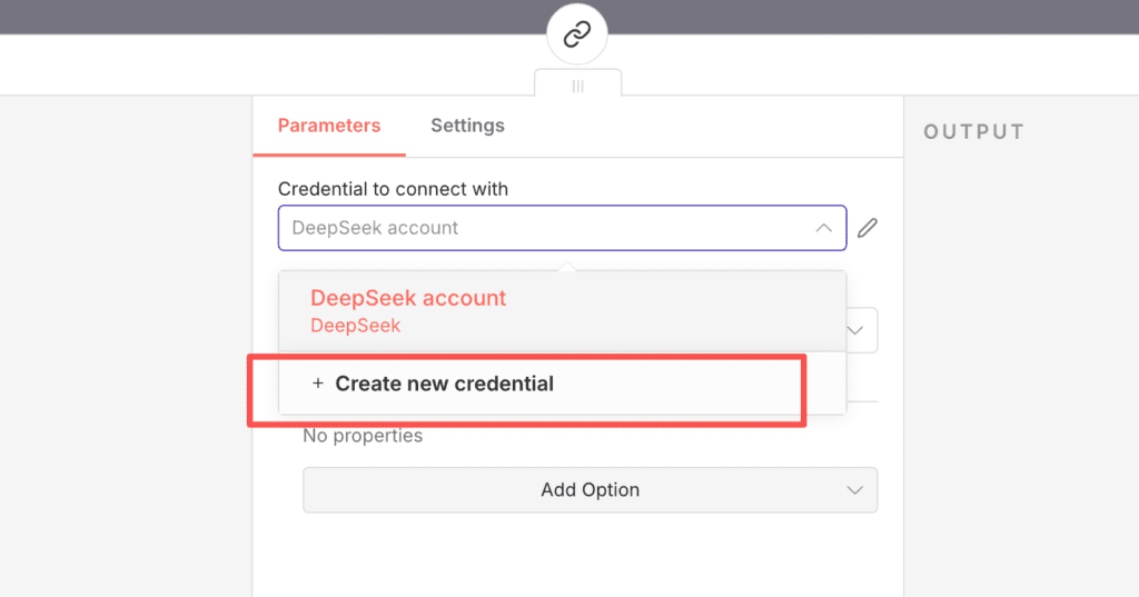要在deepseek chat model这个节点配置授权,也就是打通N8N和deepseek,允许N8N以节点的形式来调用deepseek的API。