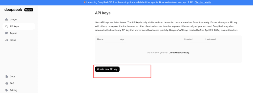 配置api key,这个需要你在deepseek先注册,https://platform.deepseek.com/sign_in,注册以后登录deepseek平台,新增api key