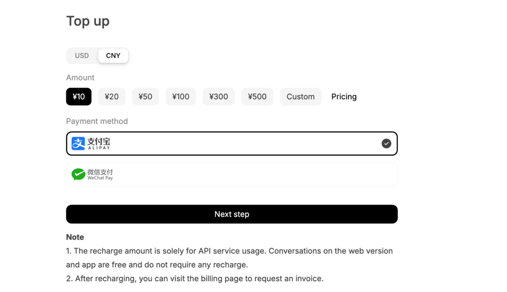 节点配置完了,我们还得购买一部分api 调用的tokens,还是回到deepseek platform后台,找到top up进行购买,我们可以使用人民币或者美金购买tokens,先买10块钱的绰绰有余了。