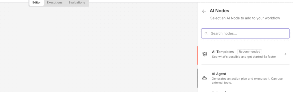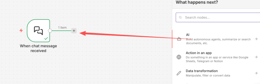 13,手动触发右侧有个小加号,我们点击新建下个节点,选择AI,来配置我们的chat node