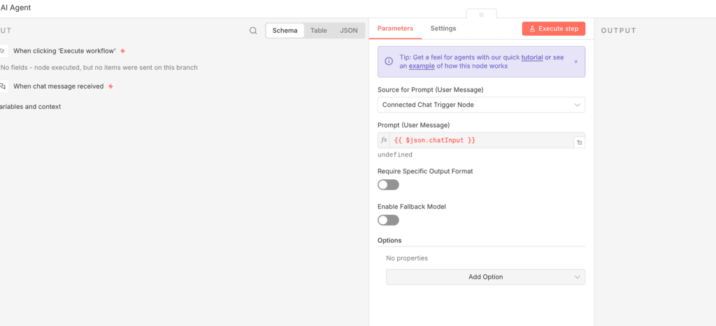 我们现在有了一个触发节点,又添加了一个AI聊天机器人节点,下一步我们来测试下我们这个AI Chat工作流是不是能够运行。