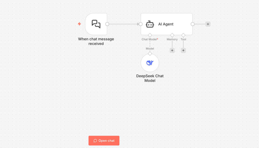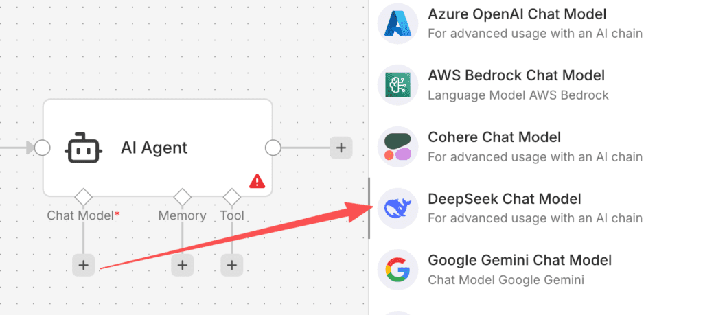 然后在AI Agent下面有个加号,让我们添加chat model,这一步非常关键,也稍微有点麻烦,我们先选择一个chat model,比如deepseek chat model