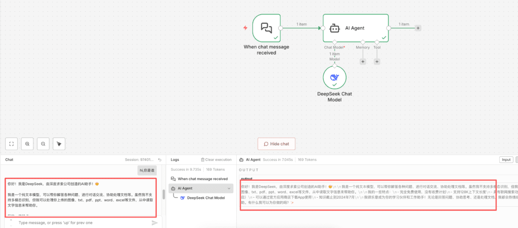 出现一个聊天对话框,我们输入“hi, 你是谁”,测试,发现output正常,我们得到了deepseek的回复,说明这个 workflow成功啦!