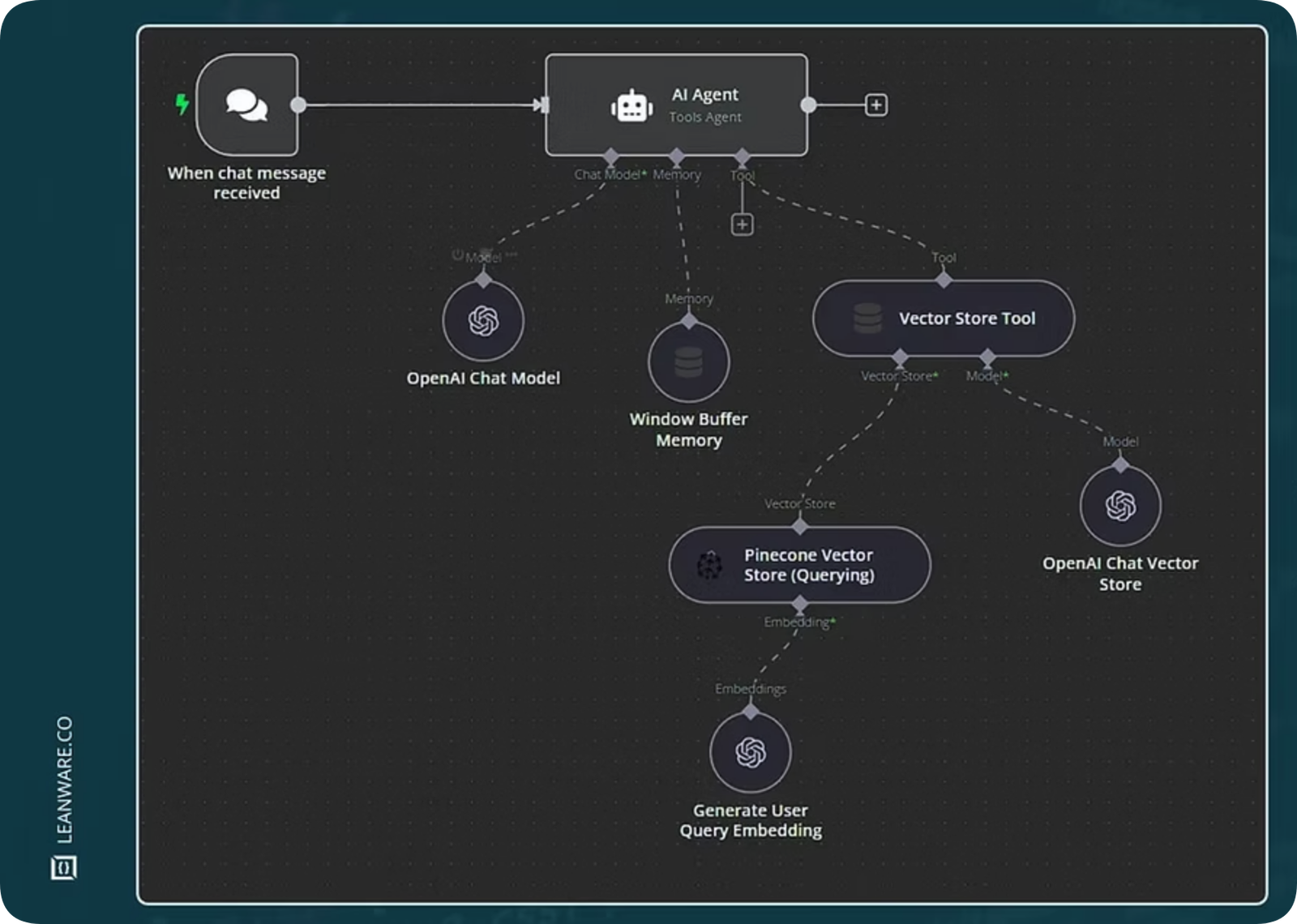 其中在AI Agent节点中,我们看到通过添加一个tool-vector store tool来实现RAG。