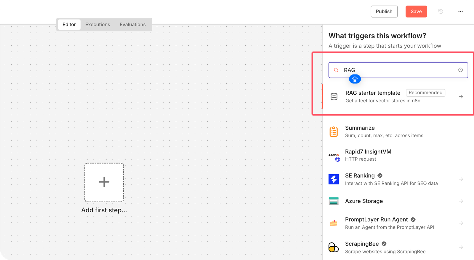 在画布右上角点击+标志,就是新建节点,然后搜索框输入RAG,出现了一个Recommended RAG Starter template,直接点击。