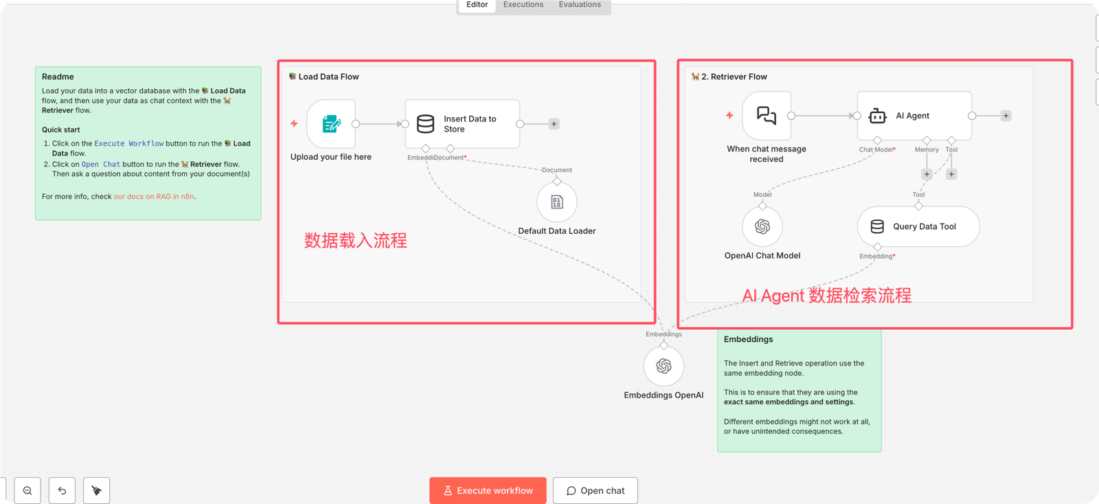 在这个RAG Demo中 有左右两部分,左边展示的是数据存储流程,右边是一个AI Agent调用向量存储进行交互的流程