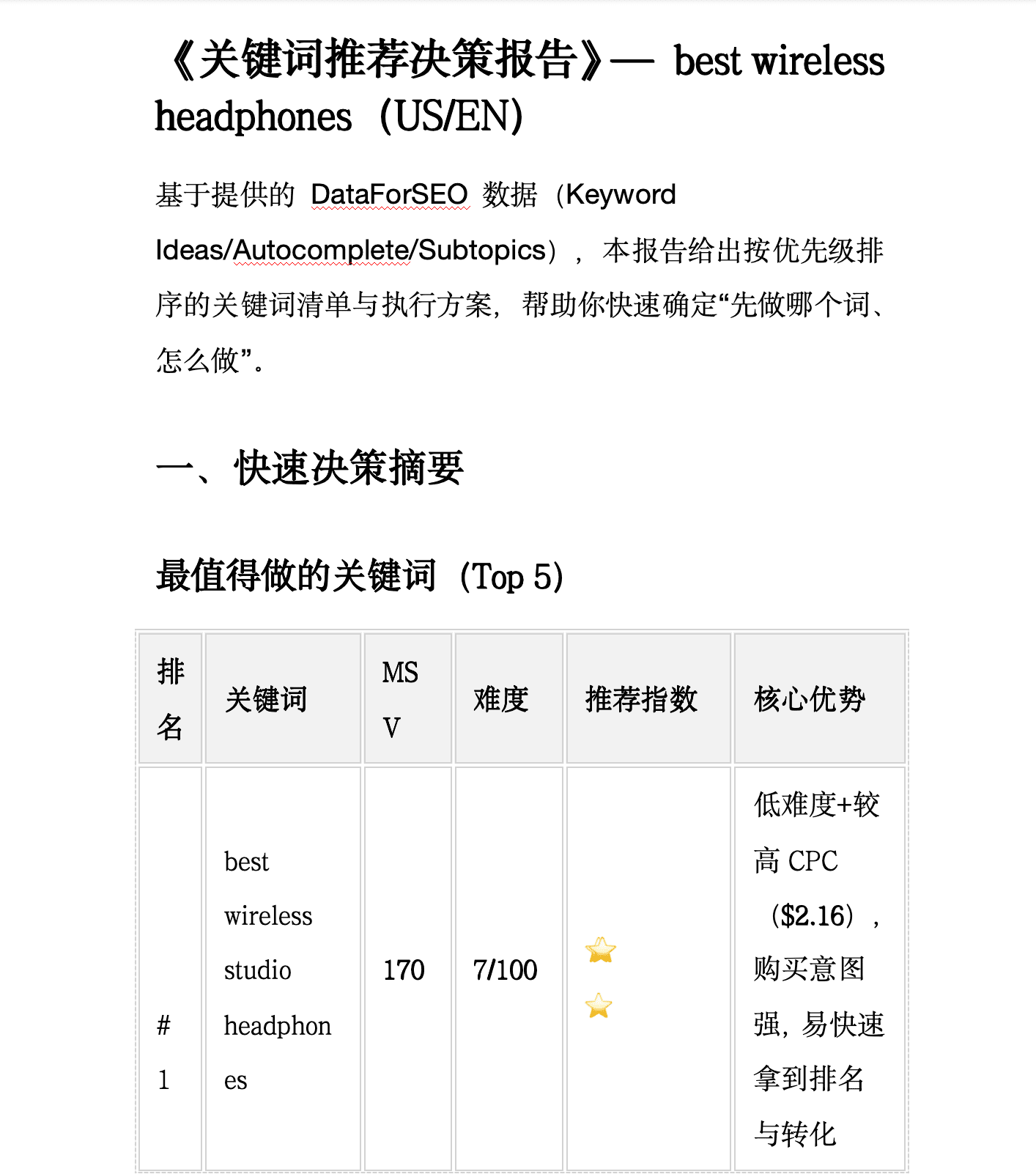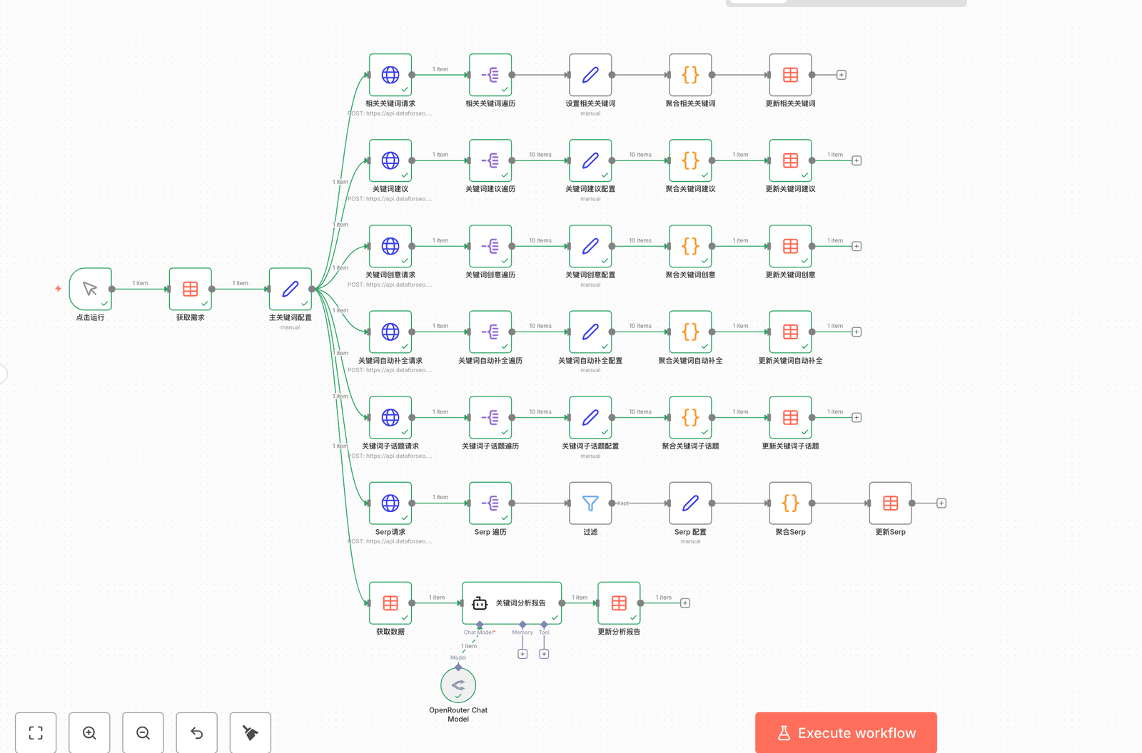 通过调取data for seo的API来获取关键词并让AI Agent给你总结生成一个SEO优化策略。