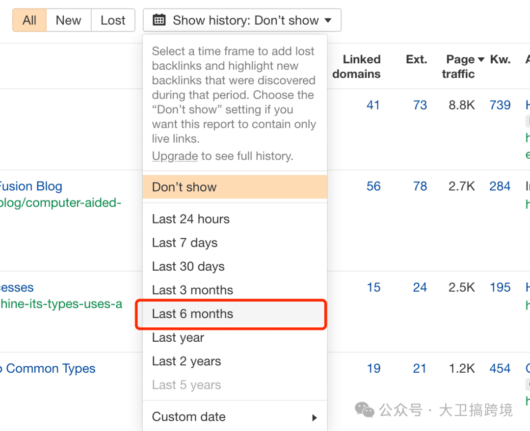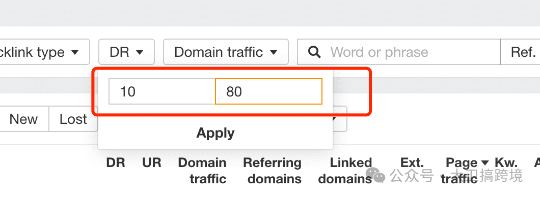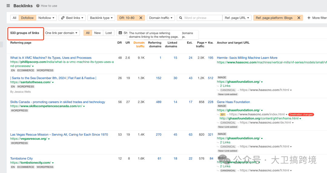 3,在backlinks里面我们能看到同行网站的所有的外链,但是我们不需要把这些外链都导出来,我们需要的是能够我们当前阶段的外链。
