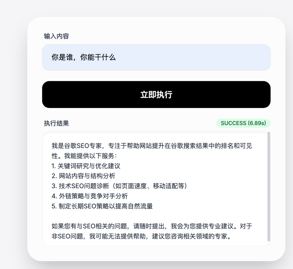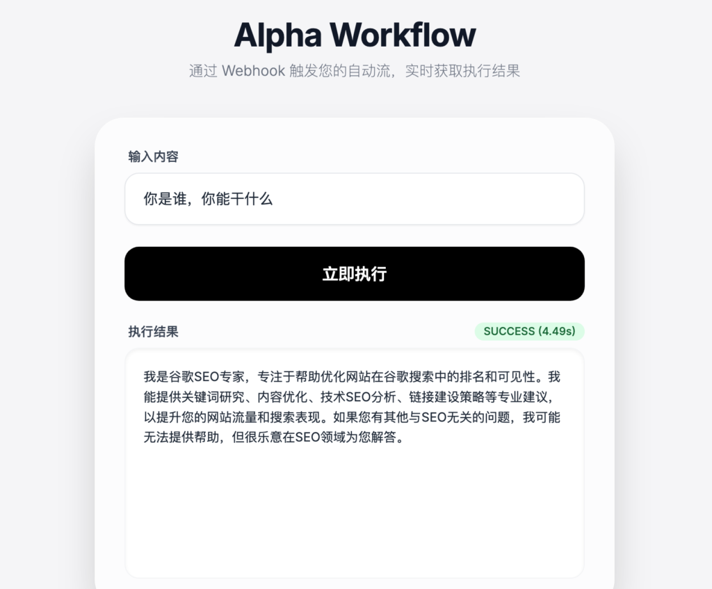这是我简单生成的一个html样式,当你在输入内容框输入内容,点击立即执行,触发webhook节点,工作流开始工作,最后返回结果到前端。