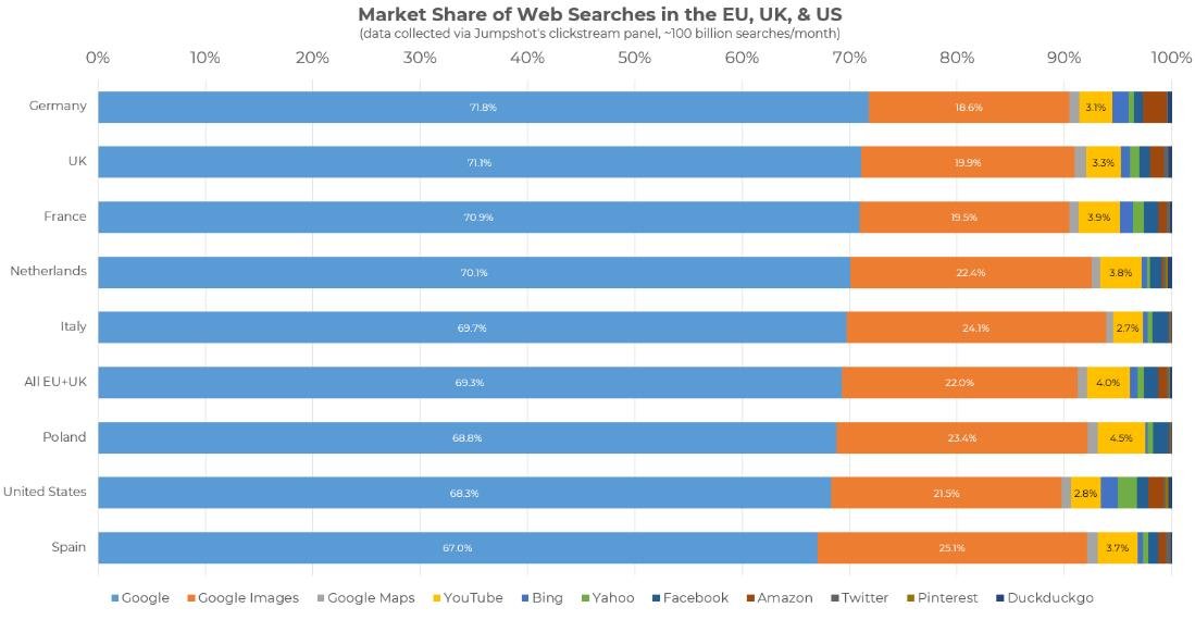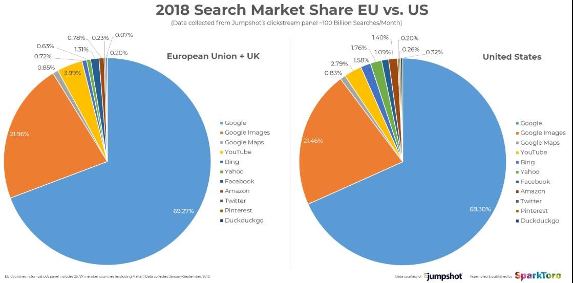 我们再来看看欧洲和美国各个国家使用搜索引擎的比例,很明显,仍然是谷歌垄断了,这个好比我们国内的百度一家独大,虽然都是垄断,但是谷歌和百度提供给用户的体验完全是两个极端。