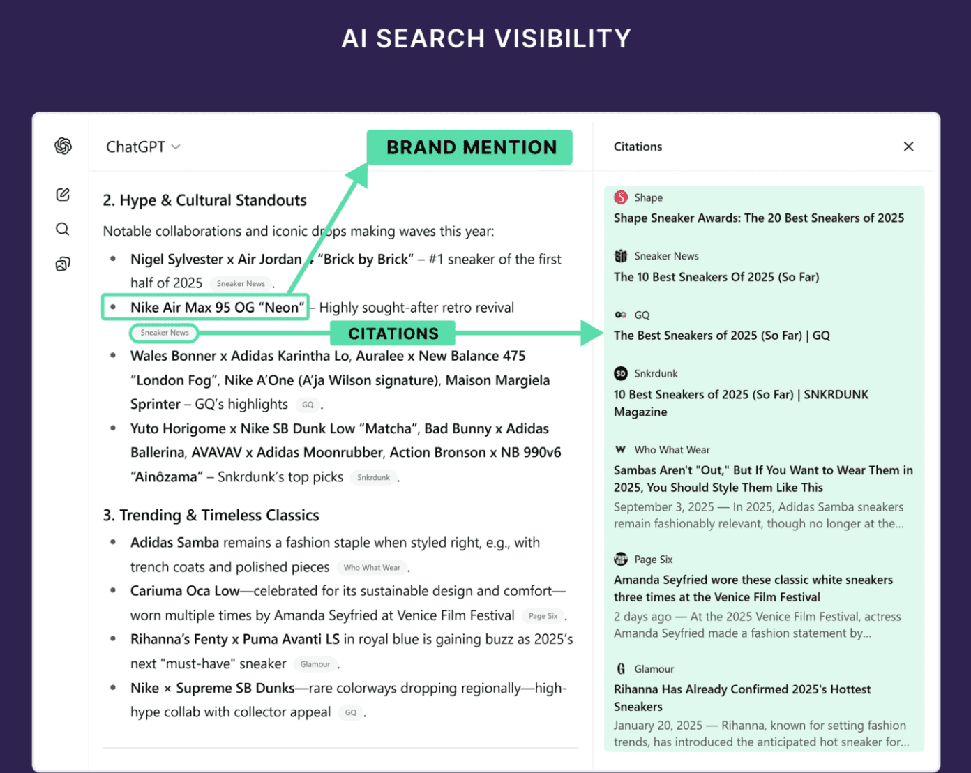 这一部分我们重点探讨的是你的品牌如何被AI看见,也就是说哪怕AI没有推荐你的链接,但是至少它在答案中提到了你的品牌名字。