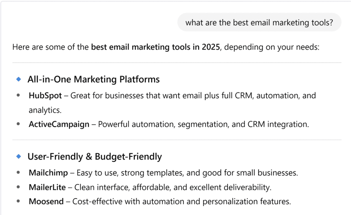 比如:我们问ChatGPT best email marketing tools brand,它会把品牌名字列出来。