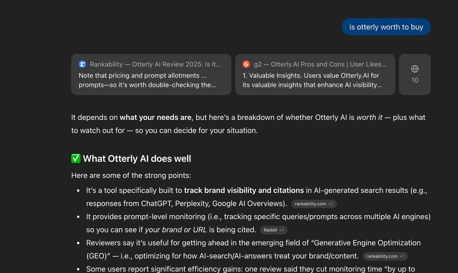 当我问ChatGPT,Otterly工具是否值得购买的时候,它会援引G2这个平台的评价