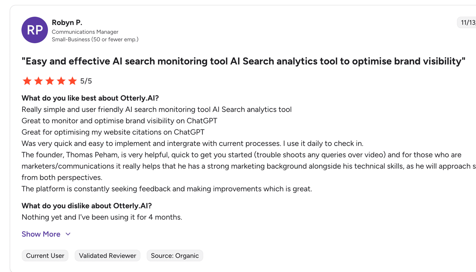 Otterly这款工具就是借助了G2这个平台来增加他们的AI品牌声量-Share Of Voice SOV