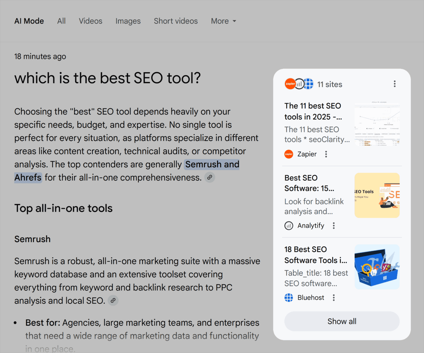 根据Semrush做的调研,当前只有很少一部分企业能够完全被AI收录,所以这就是将来我们企业的GEO机会所在。