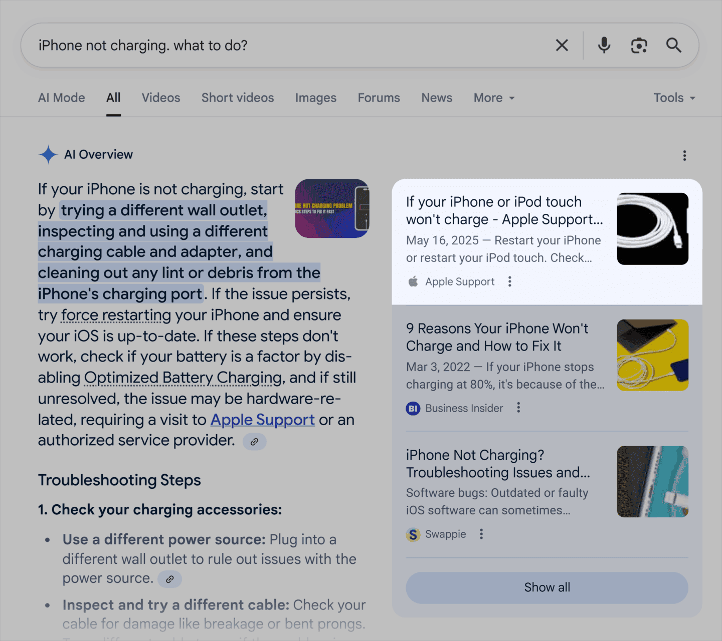 比如当我搜索有关iphone问题的时候,AI更倾向于给出Apple的官方文档