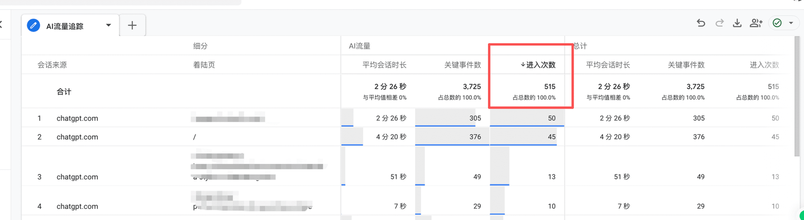 GA4后台跟踪的AI流量来源,平均停留时长接近3分钟。